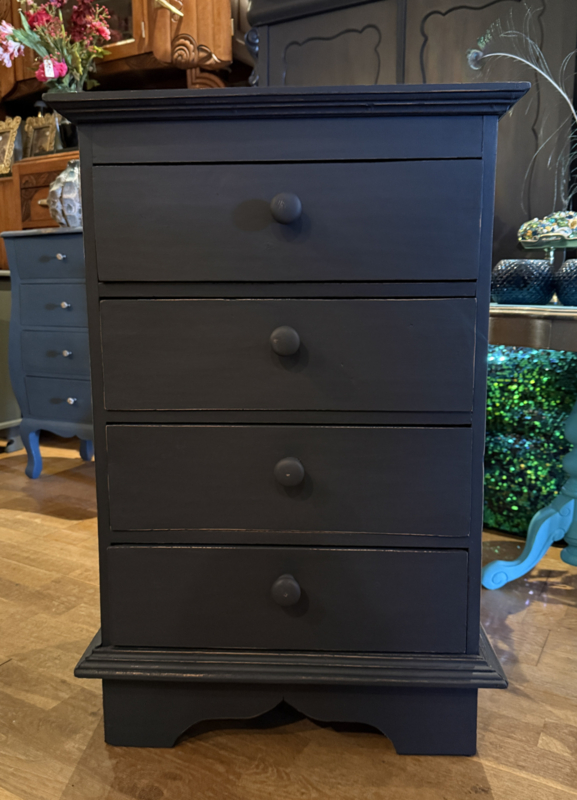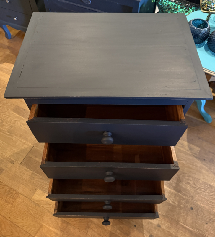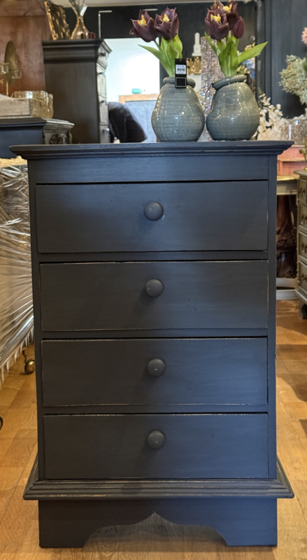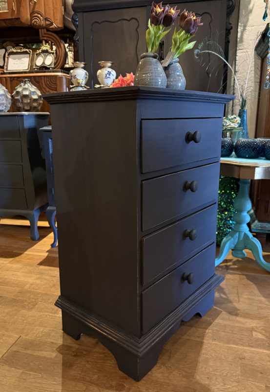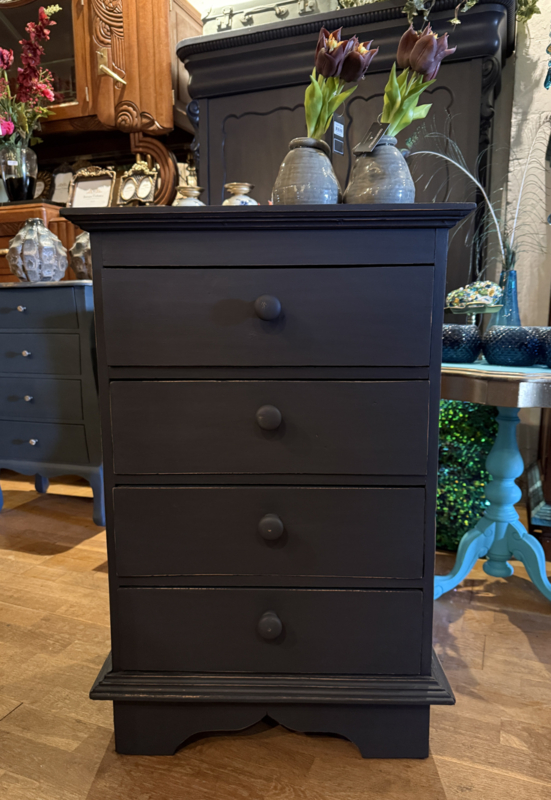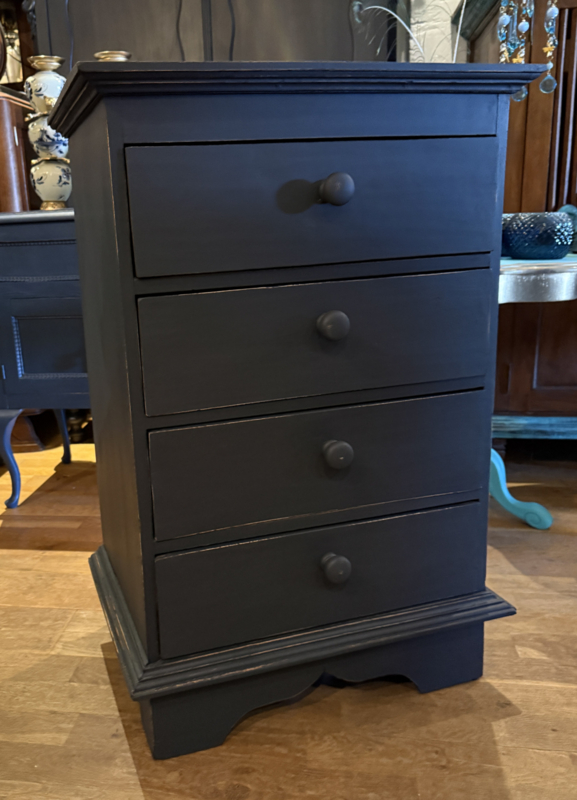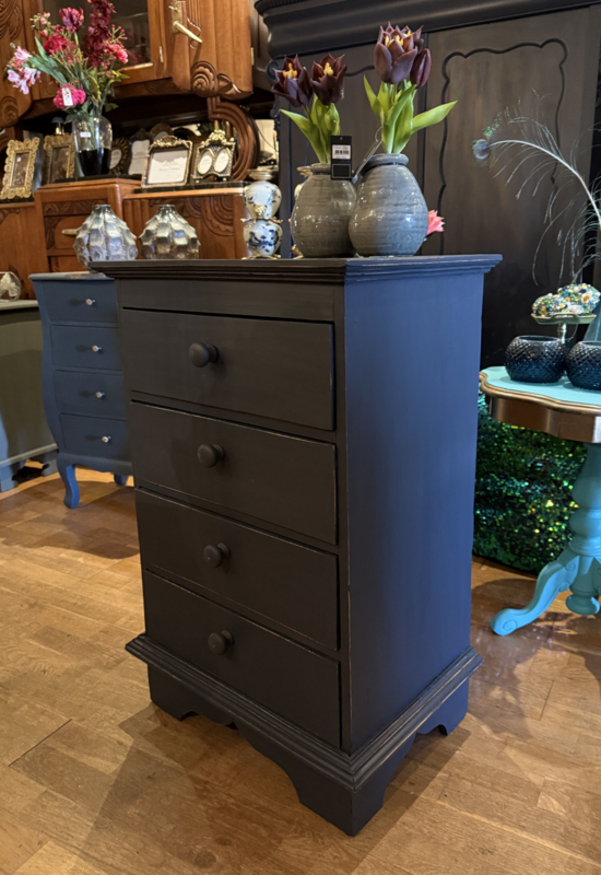 Artikelnummer: 260313 OverzichtLadekastje geschilderd in heel donkergrijs (Antracite) waarna subtiel op de randjes sleets door geschuurd. De kast heeft 4 goedlopende lades met houten knoppen. Uiterste maten HxBxD 85x56x39cm.