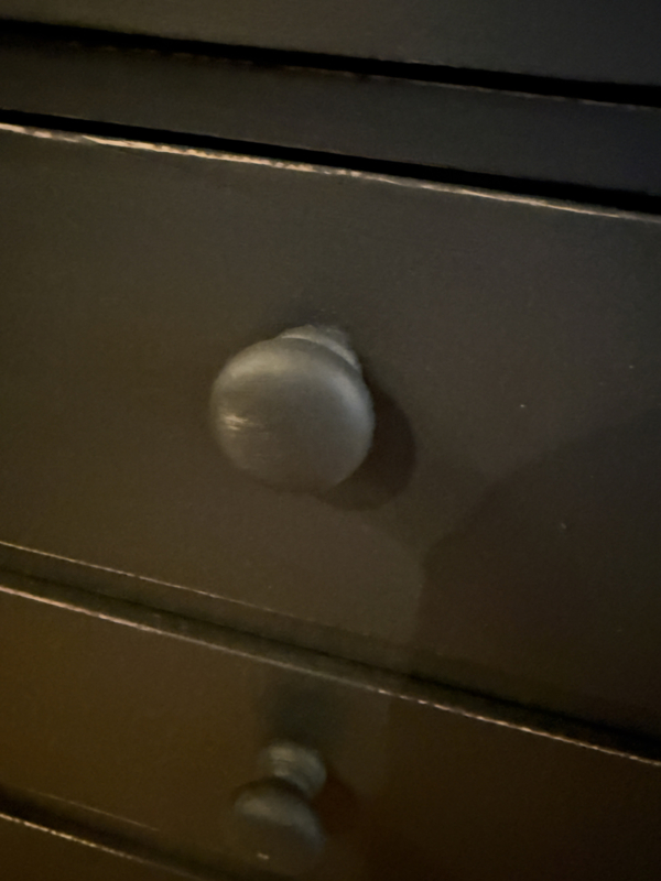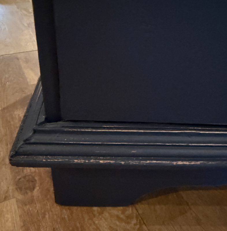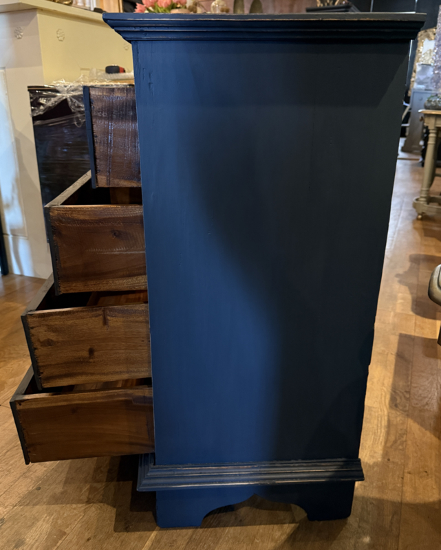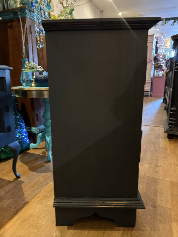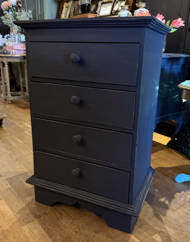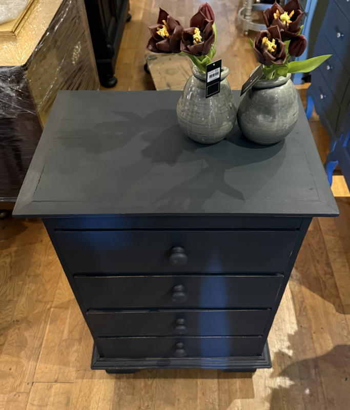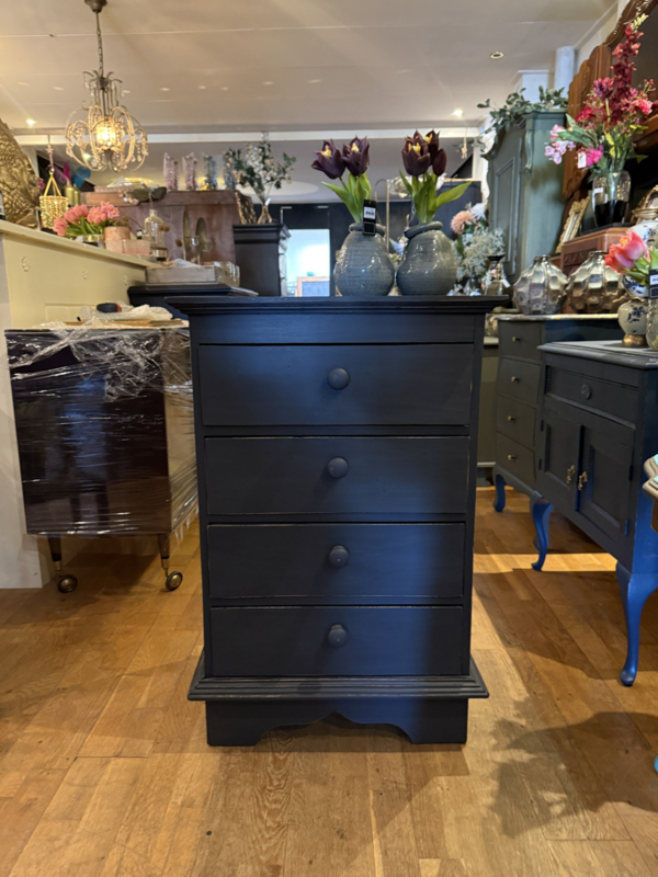 Artikelnummer: 260313 OverzichtLadekastje geschilderd in heel donkergrijs (Antracite) waarna subtiel op de randjes sleets door geschuurd. De kast heeft 4 goedlopende lades met houten knoppen. Uiterste maten HxBxD 85x56x39cm.
