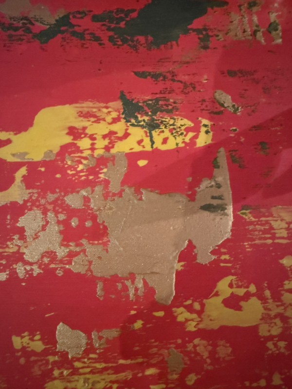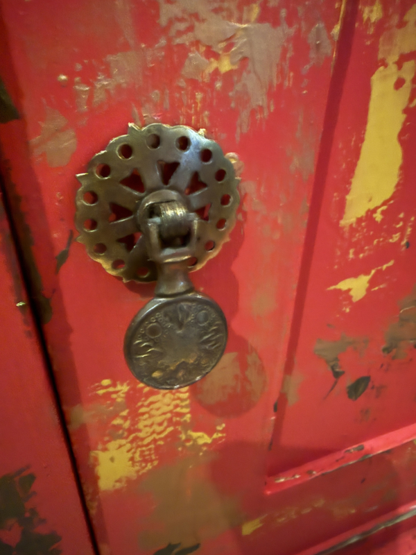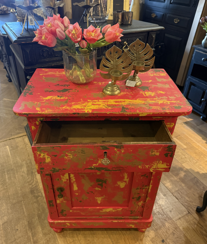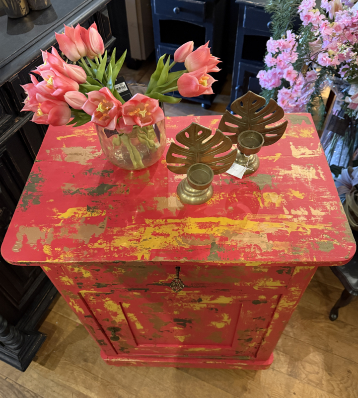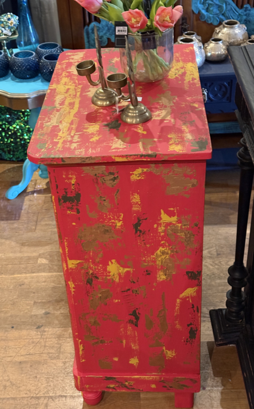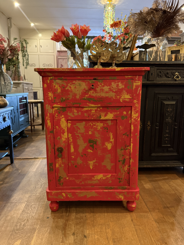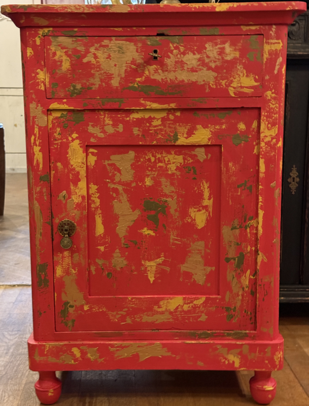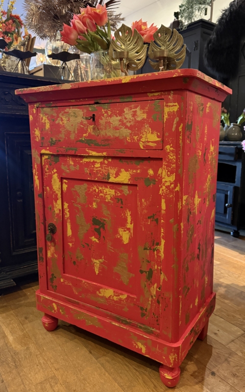 Artikelnummer: 260314 OverzichtOud doorleefd kastje waar een klein "kunstwerk" van is gemaakt. De hoofdkleur is KNALrood afgepimpt met okergeel en metallic brons en koper. Hier word je toch vrolijk van! Wie durft? Uiterste maten HxBxD 89,5x62,5x39,5cm.