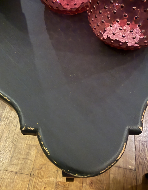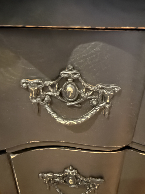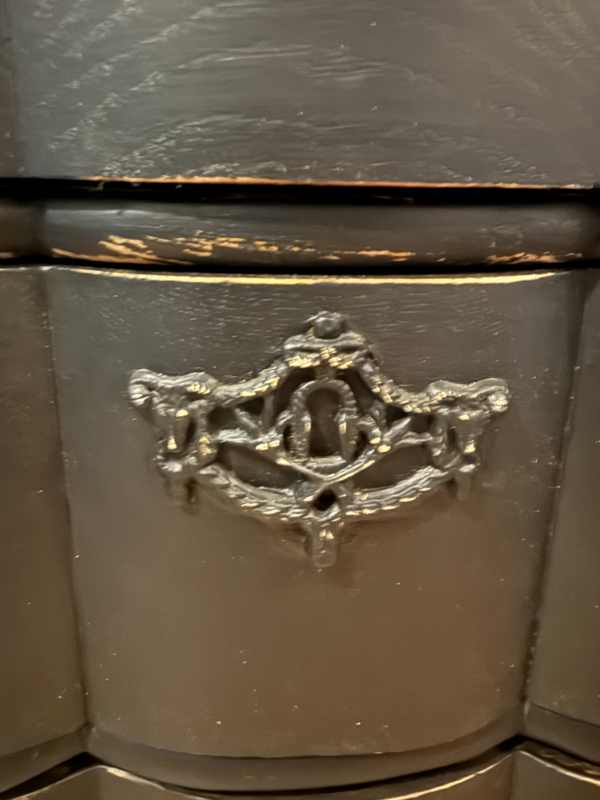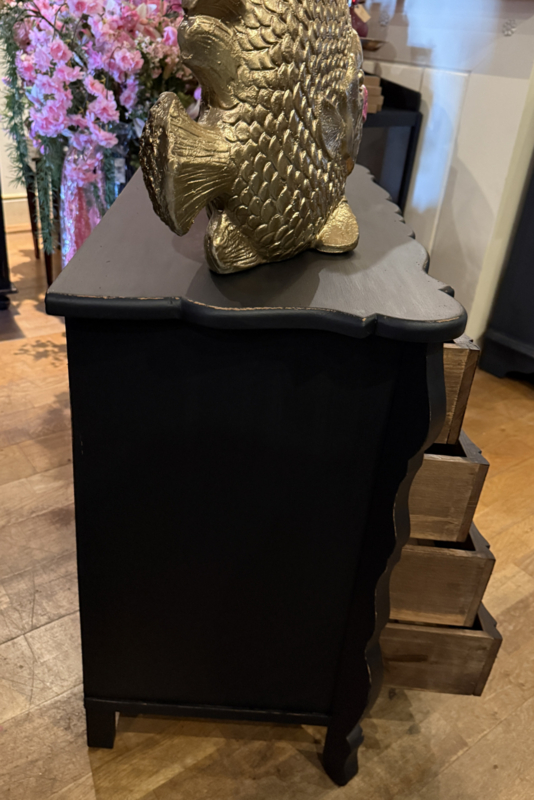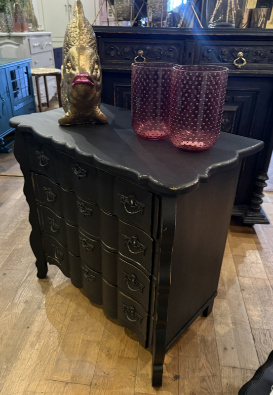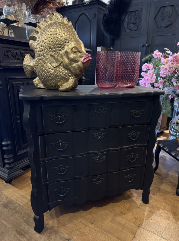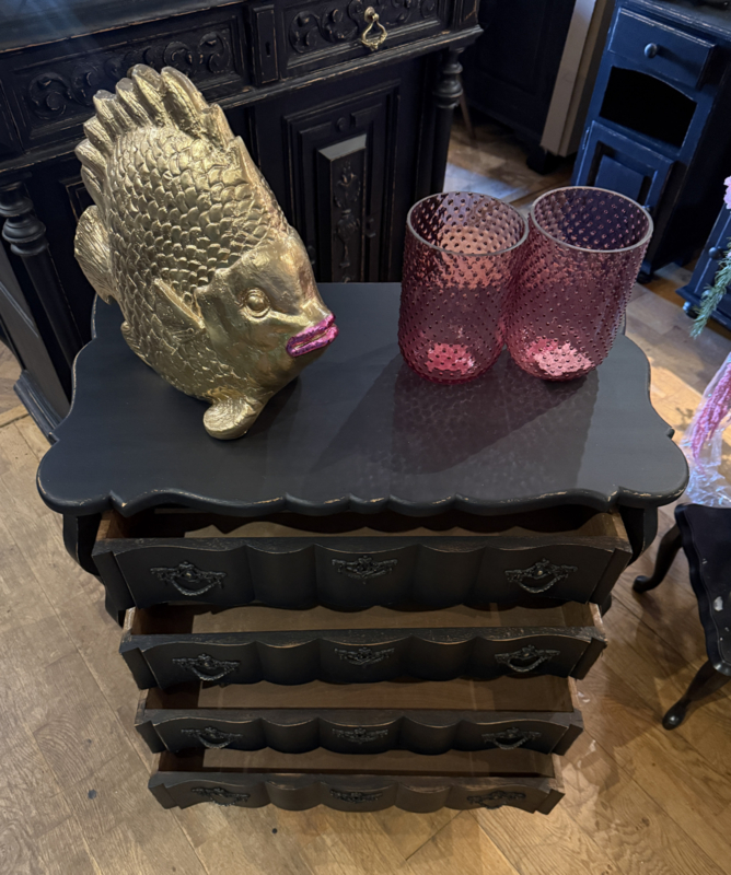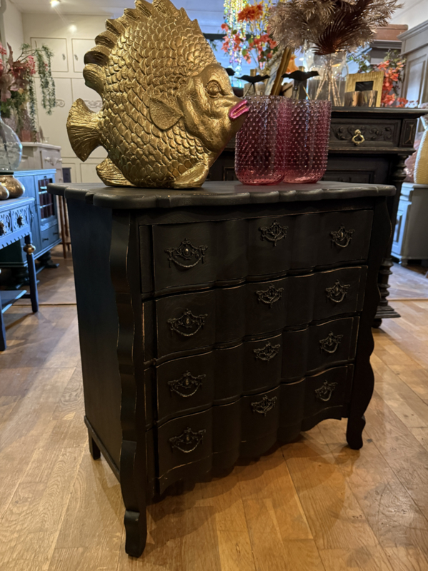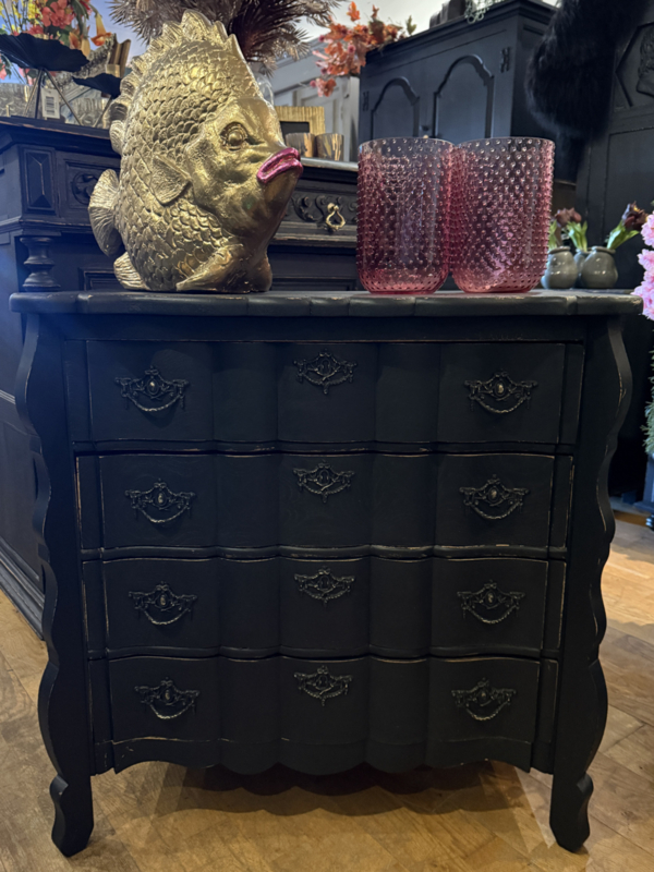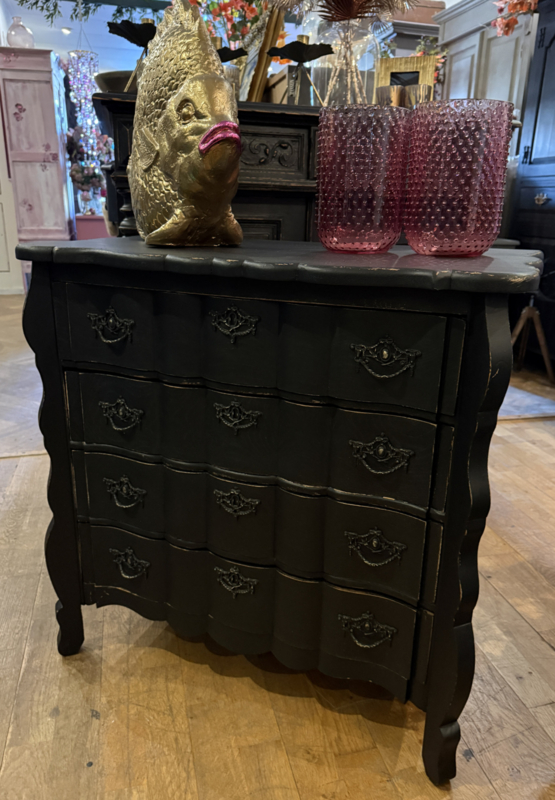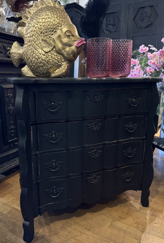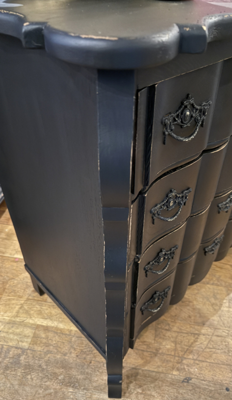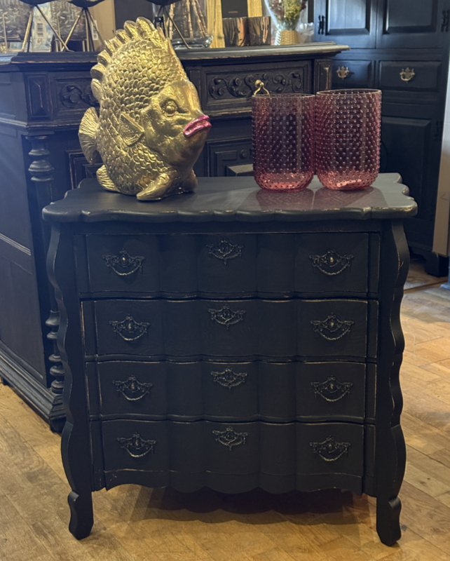 Artikelnummer: 260316 OverzichtOrgelgebogen kastje geschilderd in het zwart ((Charcoal) waarna subtiel door geschuurd om het oude karakter te bewaren. Dit vintage kastje heeft 4 lades voorzien van sierlijk beslag en is in goede vintage staat. Is het geen plaatje? Uiterste maten HxBxD 73x74x40cm.