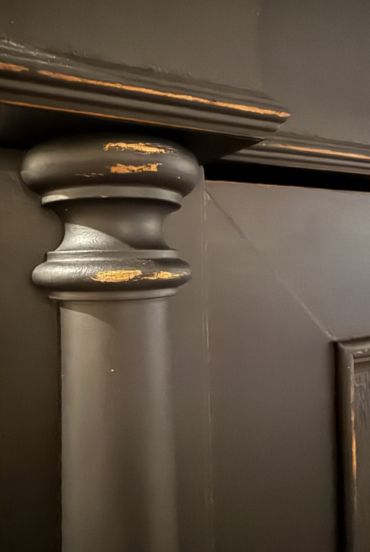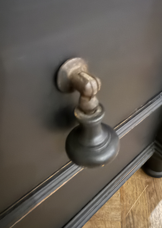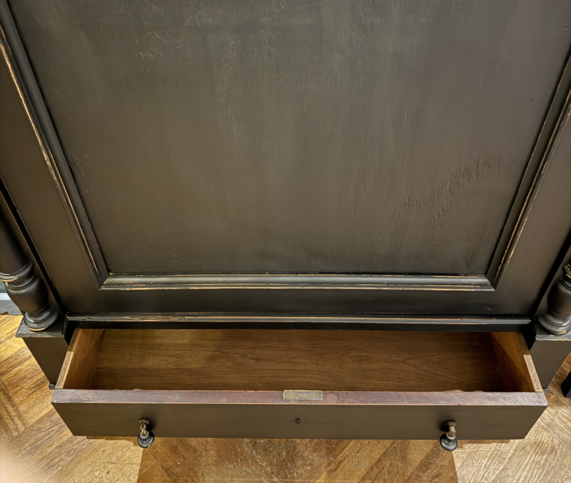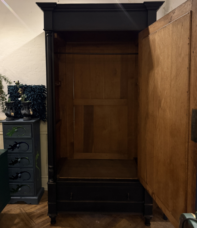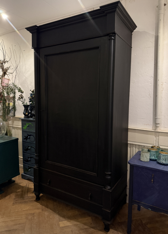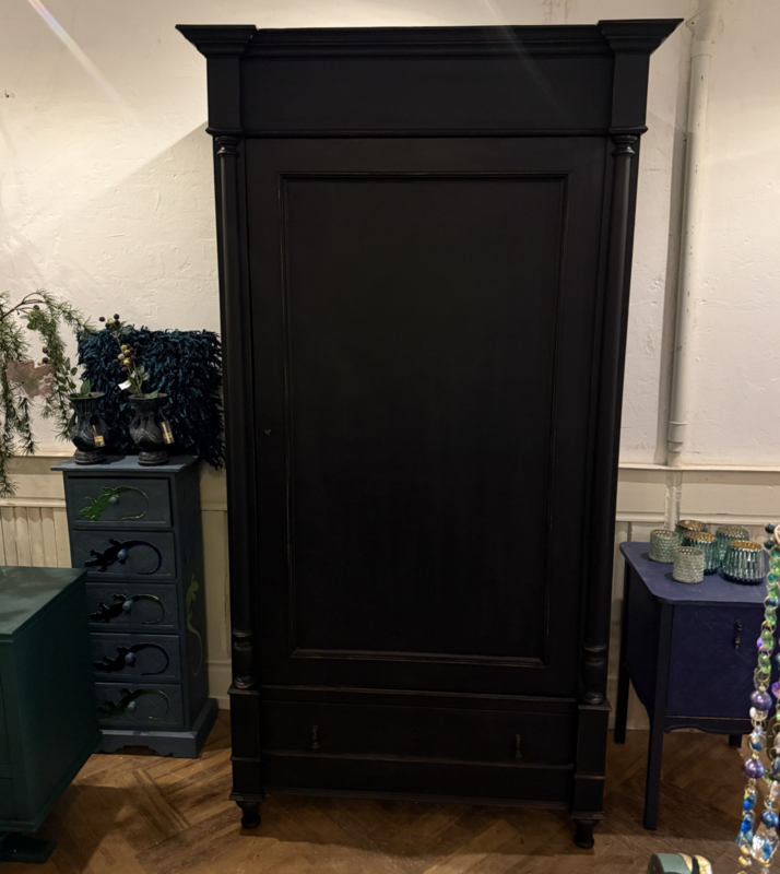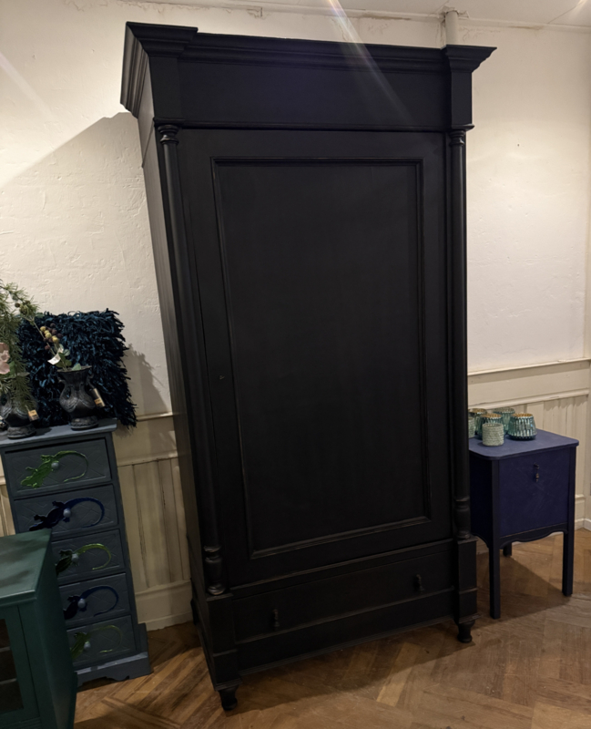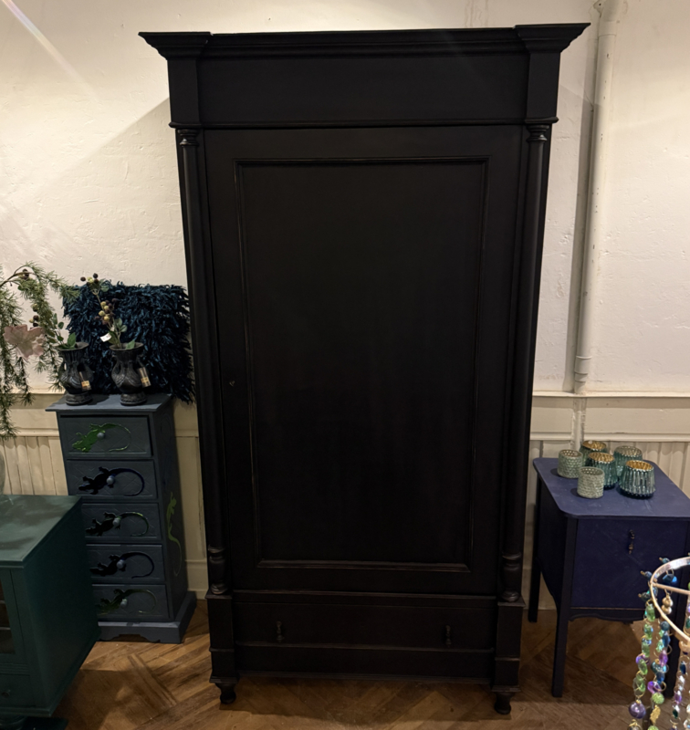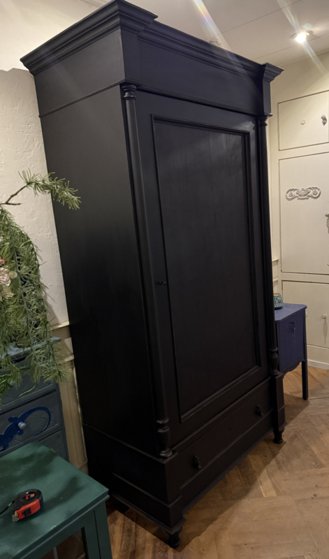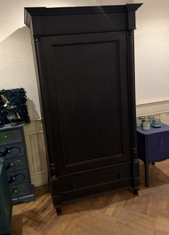 Artikelnummer: 260319 OverzichtGrote antieke ééndeurskast geschilderd met zwart (Charcoal) en daarna flink door geschuurd om het oude karakter te bewaren. De kast is van origine een garderobekast maar desgewenst zijn er planken in te leggen en kun je er heel veel in kwijt. Wij hebben eventueel al twee planken voor je erbij. Het gaat hier om een doorleefde kast maar steviger ga je die niet vinden, de kast is dan ook loodzwaar! De kast van eikenhout is geheel demontabel en makkelijk te monteren middels 4 pinnen that's all ;-). Uiterste maten van deze karaktervolle kast HxBxD 216x116x64cm.