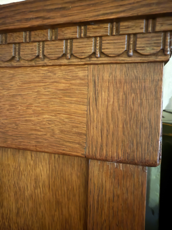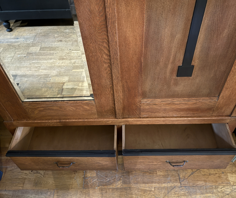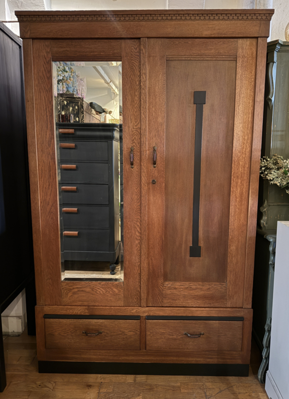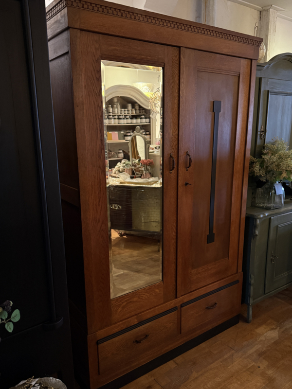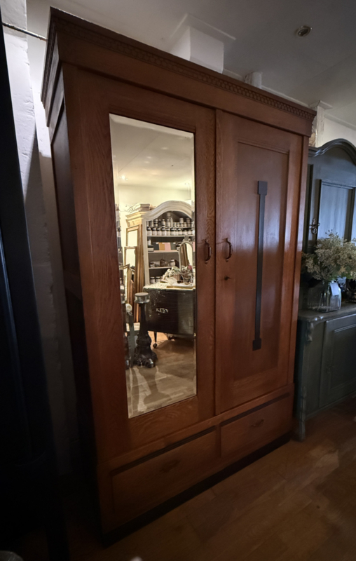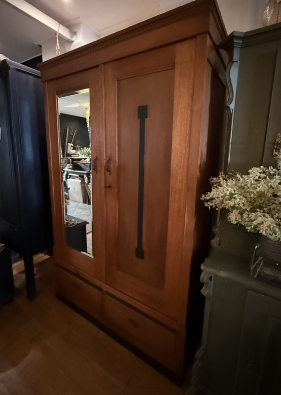 Artikelnummer: 260325 OverzichtVintage linnenkast in Art Deco stijl specifiek Amsterdamse School. De kast heeft twee deuren, de linker heeft een facet geslepen spiegel en de rechter is een paneeldeur met verticaal ornament. Achter deze deuren een zee van ruimte middels verstelbare planken. In het onderstel zitten twee ruime lades. De kast is voorzien van prachtig beslag. Deze eiken kast uit de jaren 20, 30 is in zeer goede staat en geheel demontabel. Uiterste maten van deze antieke legkast HxBxD 193,5x124x50,5cm.
