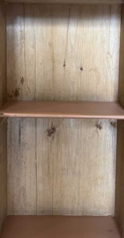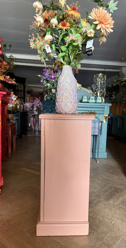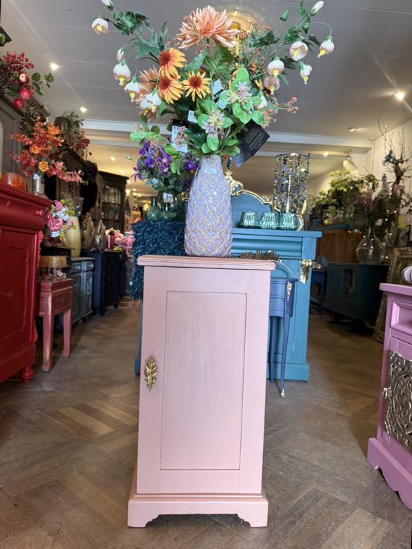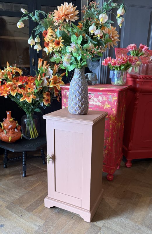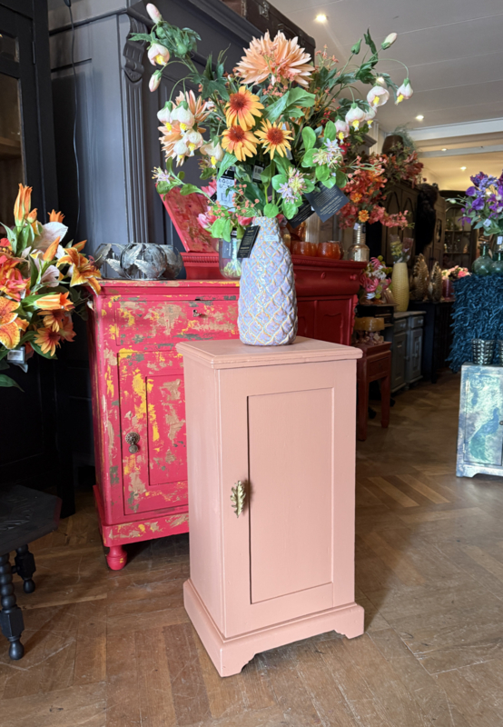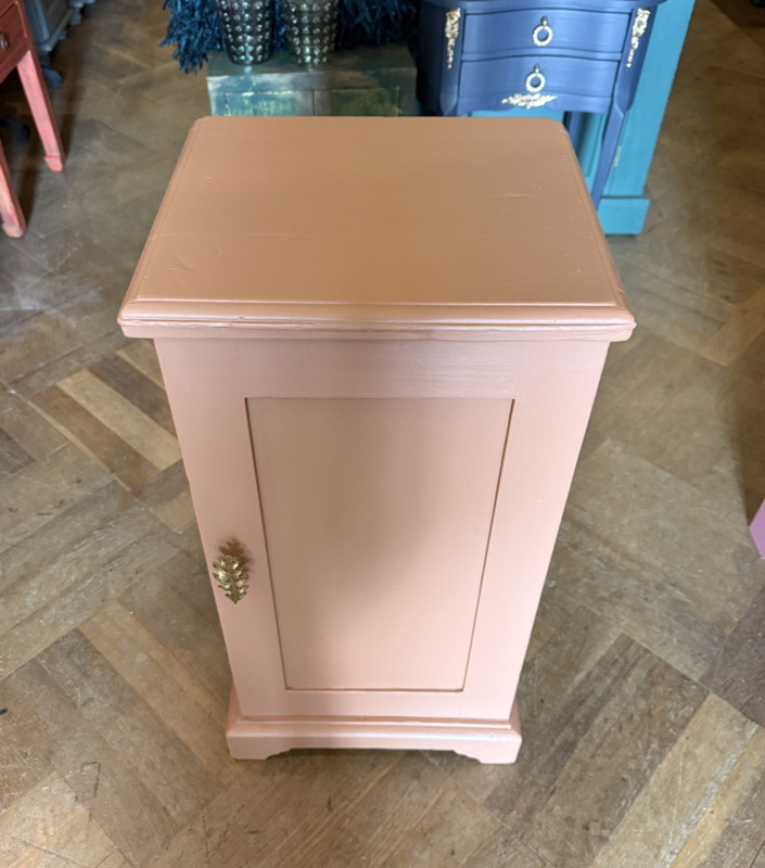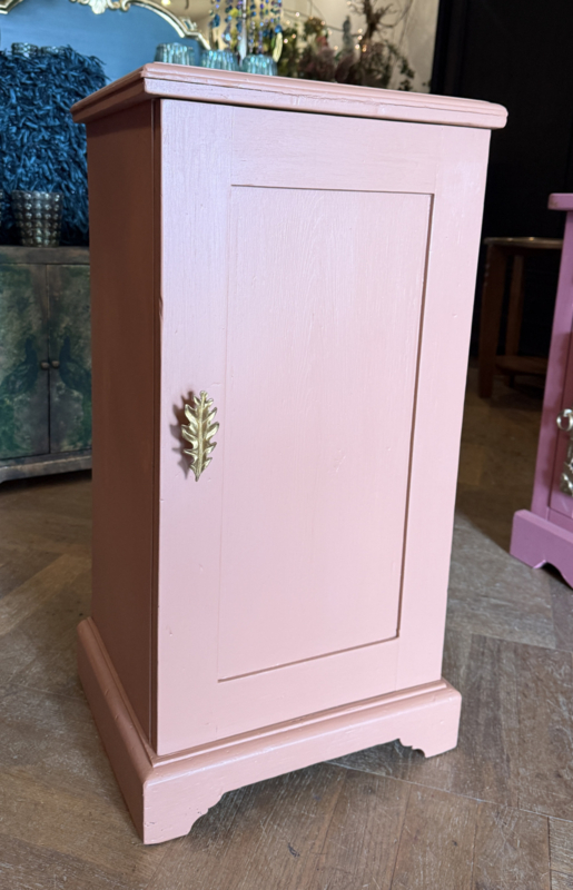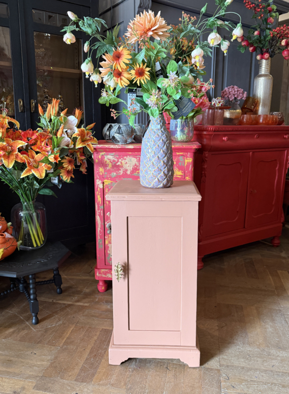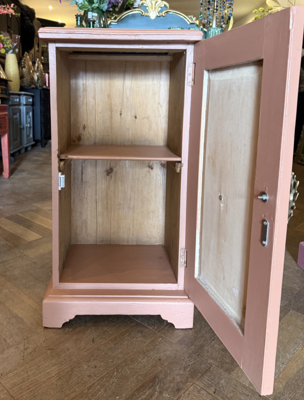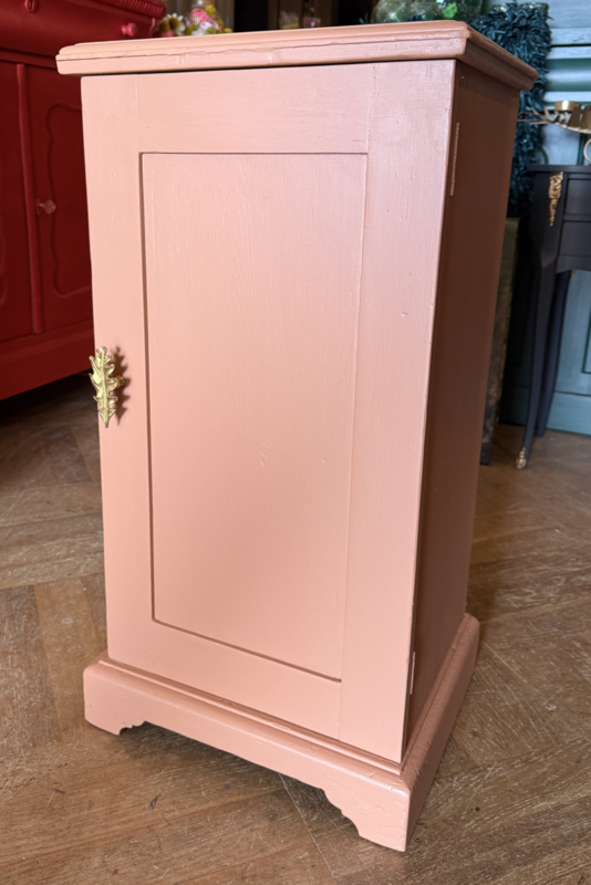 Artikelnummer: 260321 OverzichtVintage nachtkastje geschilderd in een abrikoos kleur. De knop hebben we vervangen voor een goudkleurig blad. Achter het deurtje een ruimte met één plankje. Is het geen plaatje? Uiterste maten HxBxD 74x38x33cm.