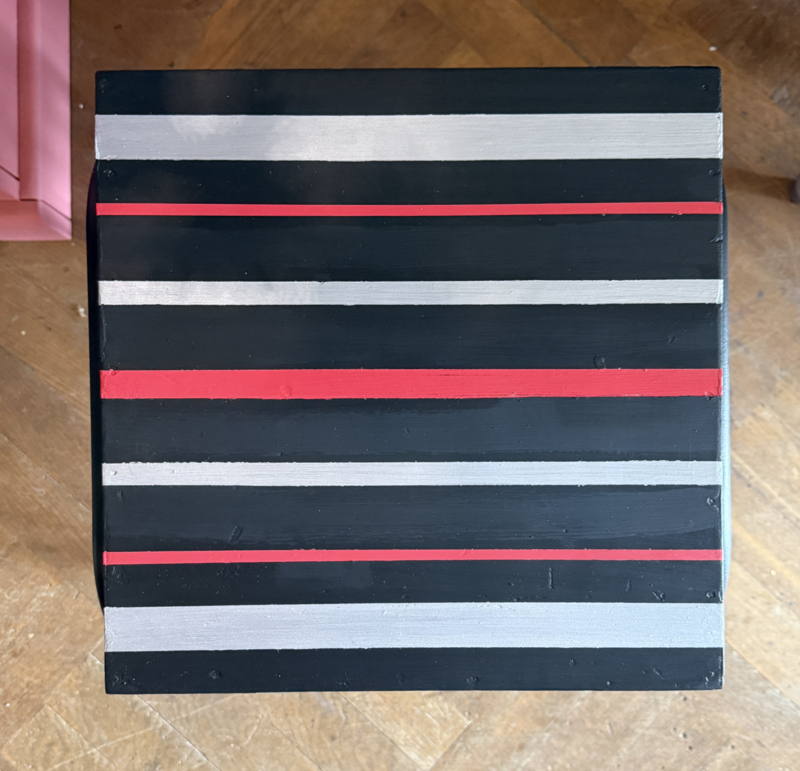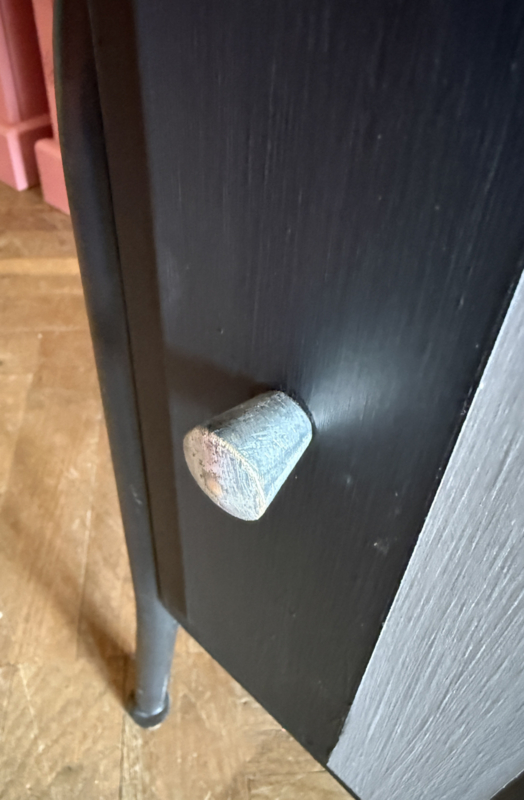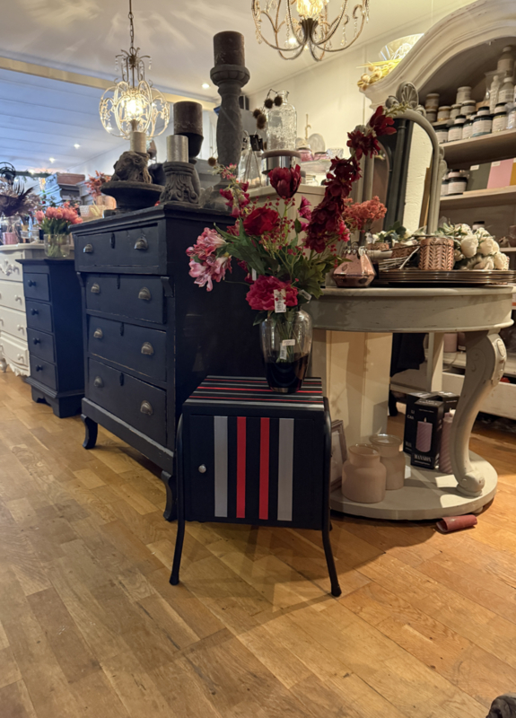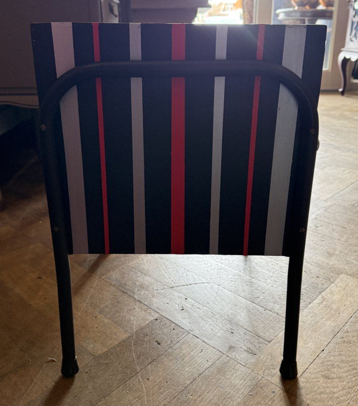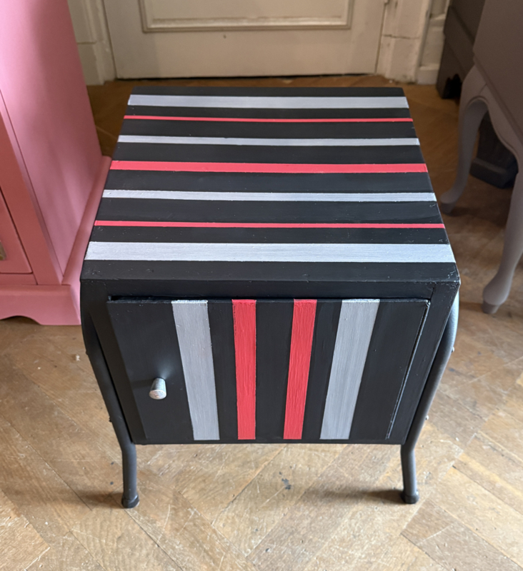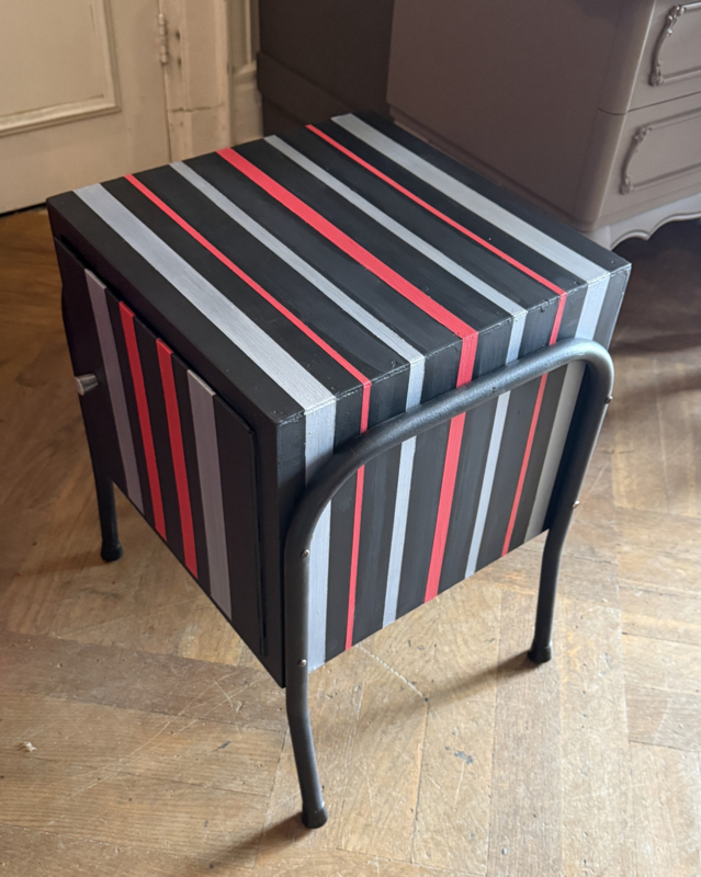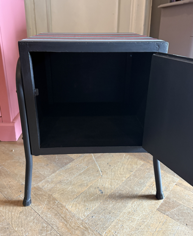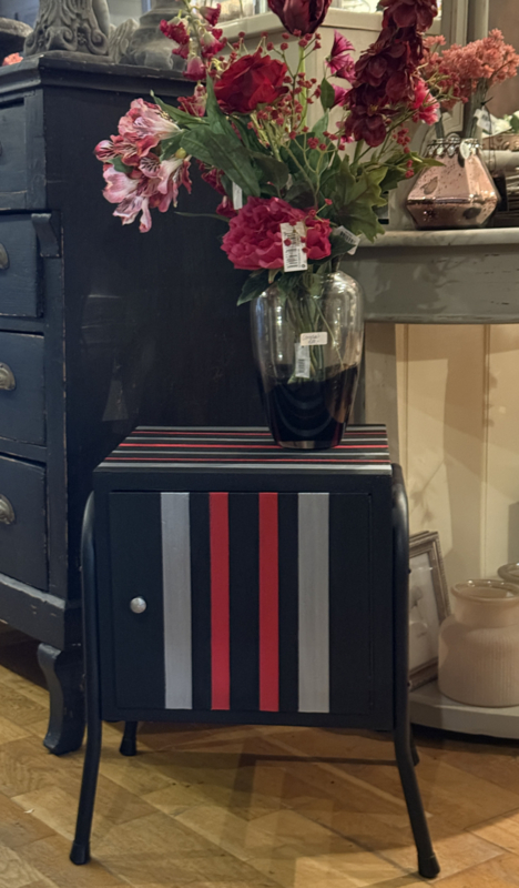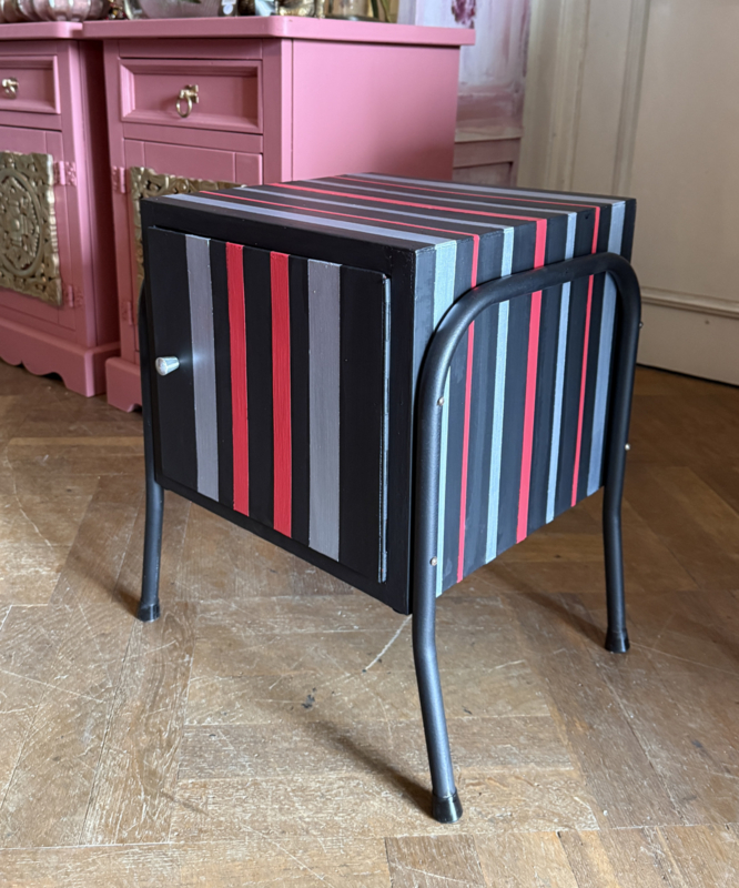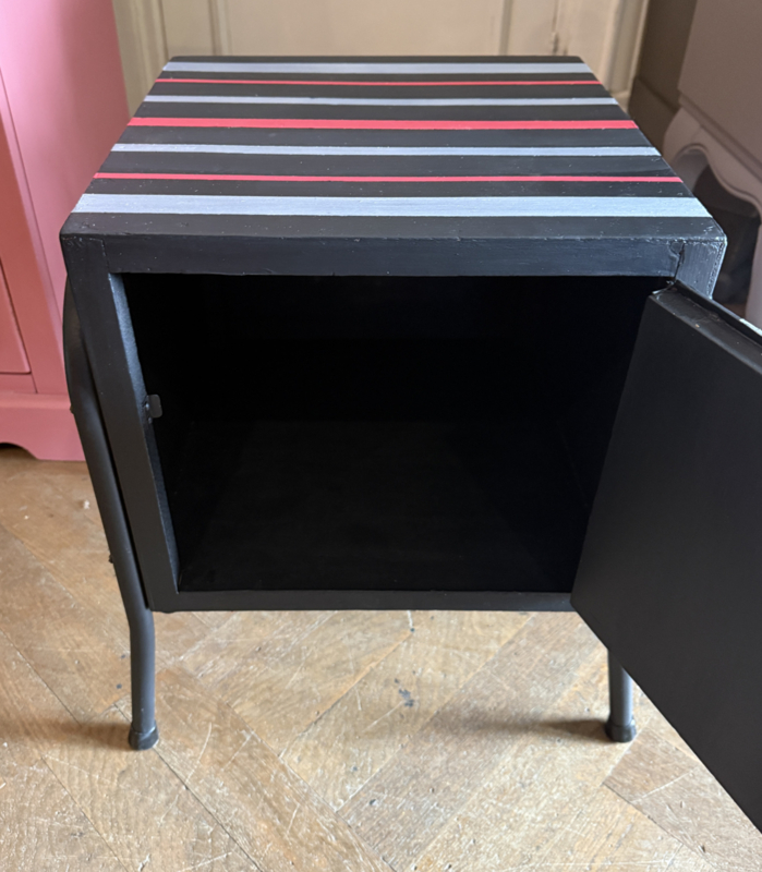 Artikelnummer: 260323 OverzichtGrappig vintage kastje uit de jaren 60. Niet meer helemaal netjes maar zeker uniek. Leuk opgepimpt in de kleuren zwart rood en zilver. Het kubuskastje "hangt" tussen twee beugels die meteen de pootjes vormen. Achter het deurtje één ruimte. Dit kastje is ook super leuk als nachtkastje in een kinderkamer. Uiterste maten van dit unieke meubeltje HxBxD 48,5x38,5x34,5.
