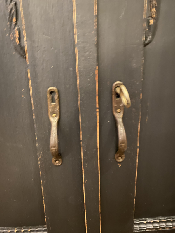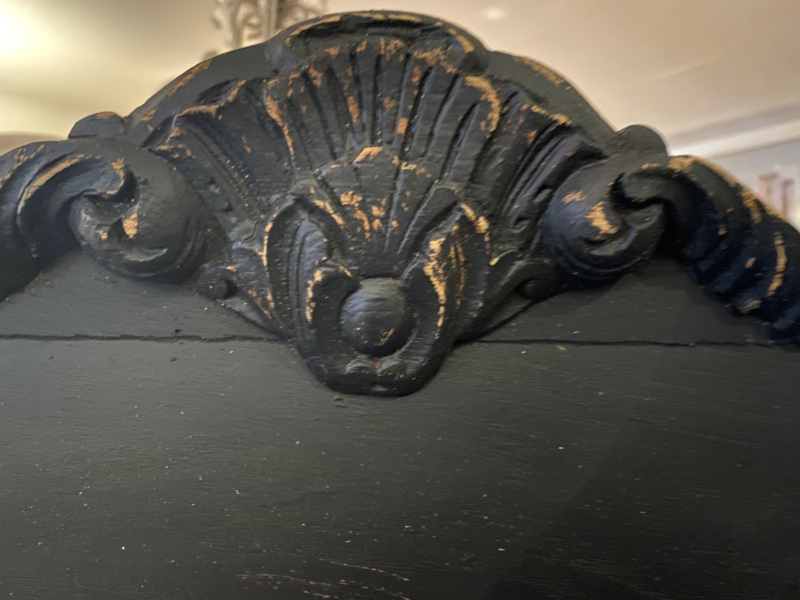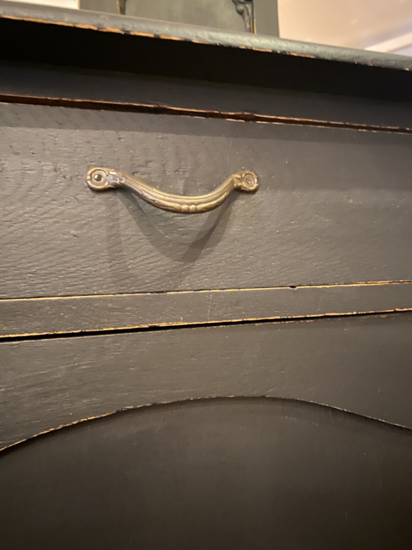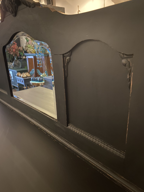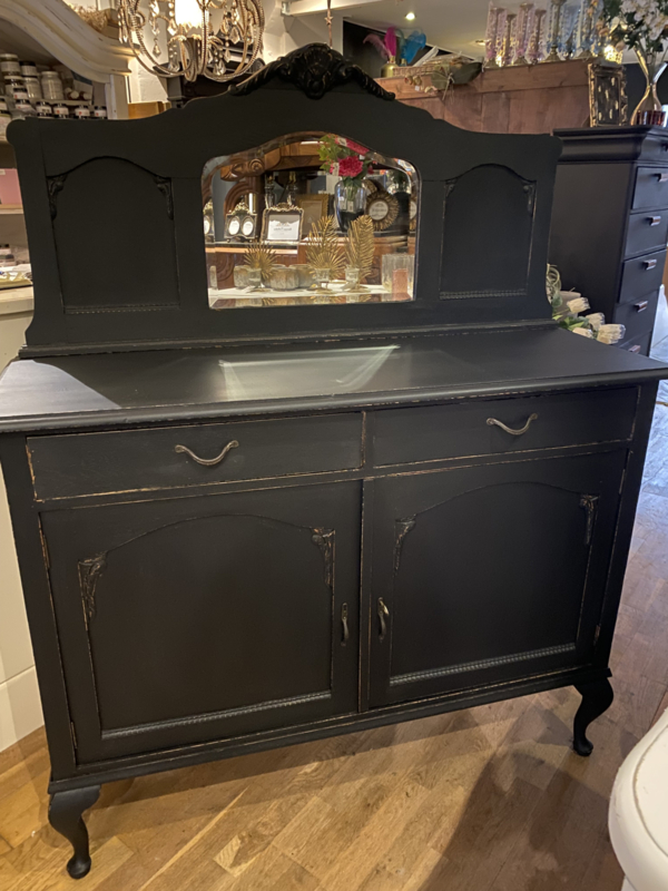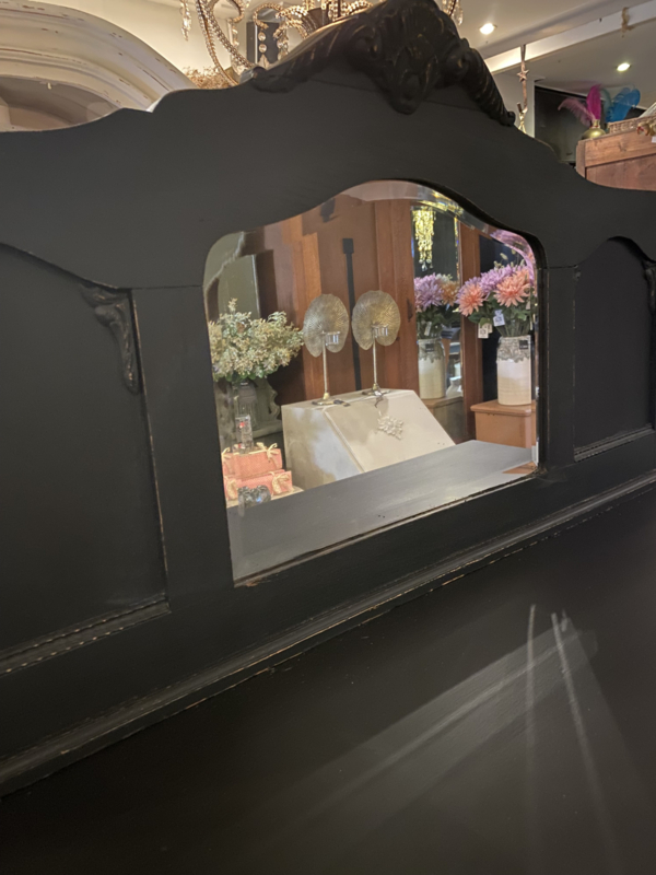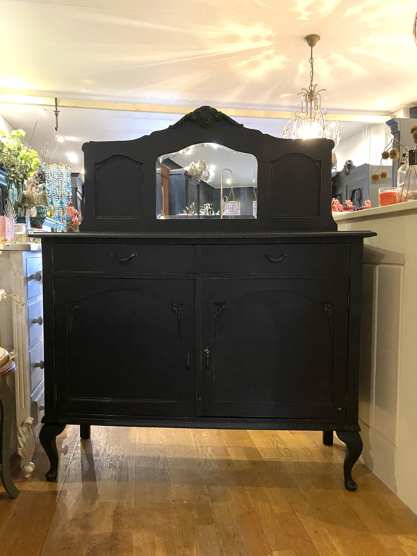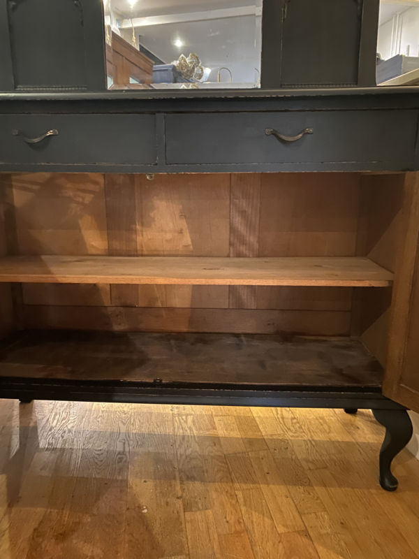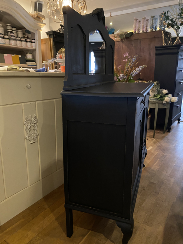 Artikelnummer: 260402 OverzichtAntiek dressoir met opstand waar een spiegel inzit. Wij hebben het geschilderd met ORB Paint in de kleur Charcoal (zwart) en doorgeschuurd op de randen en ornamenten. Achter de deurtjes 1 grote plank over de hele breedte en daarboven nog 2 lades.