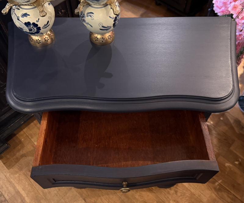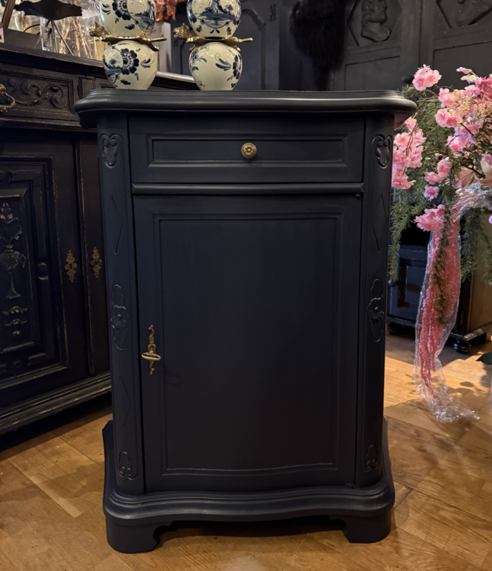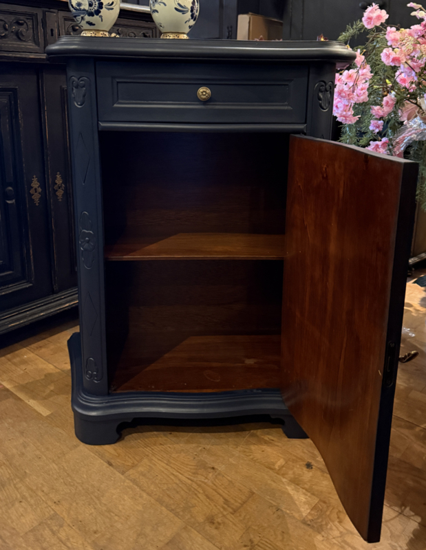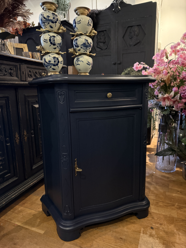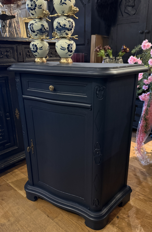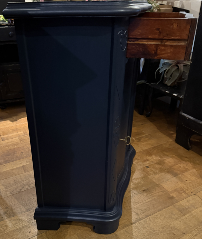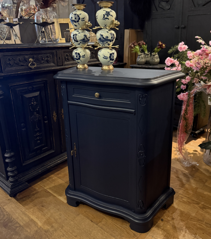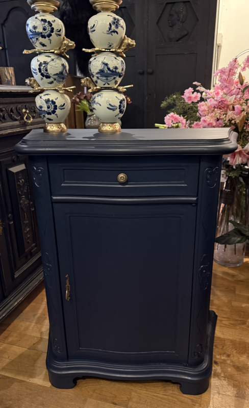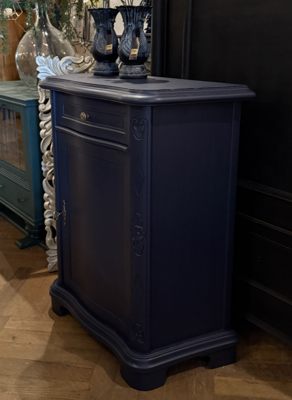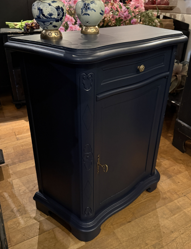 Artikelnummer: 260404 OverzichtKlassiek vintage kastje geschilderd met Midnight Blue een diep donkerblauw. Dit mooie kastje heeft achter het deurtje één plank en bovenin nog een handige lade. Doordat het een ondiep kastje is met bescheiden maten is het bijzonder geschikt voor kleine ruimtes zoals gang of hal. Is het geen plaatje? Uiterste maten HxBxD 85x74x33cm.