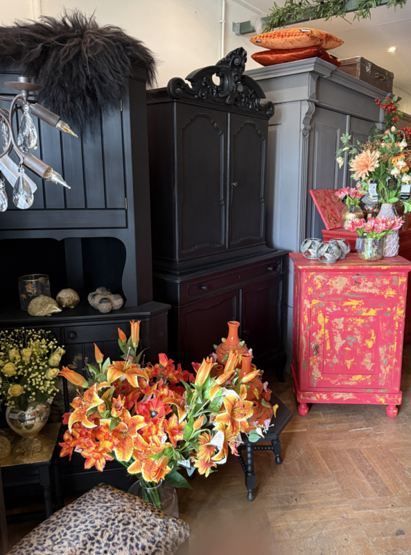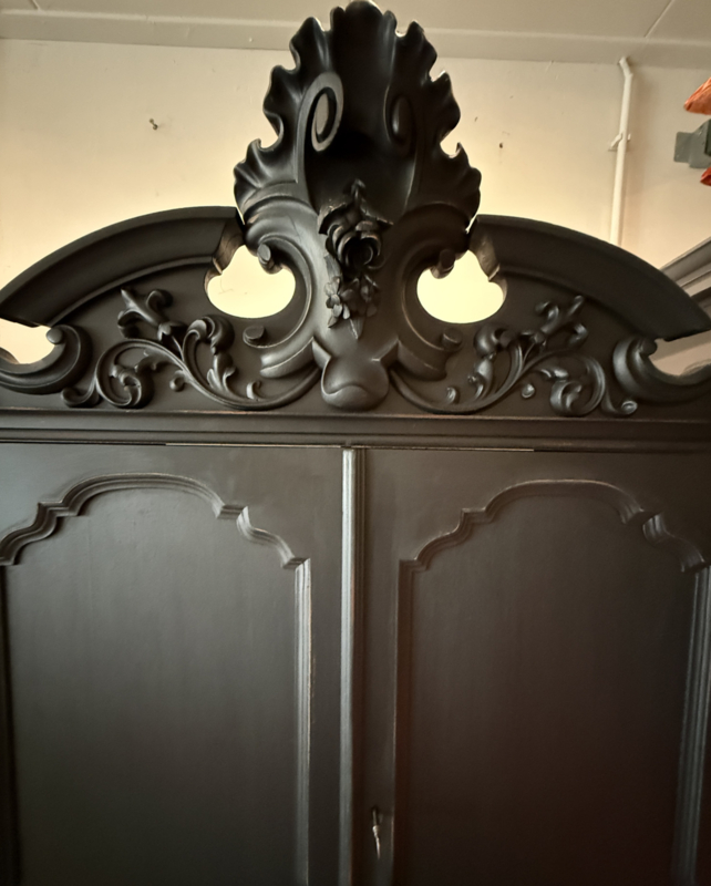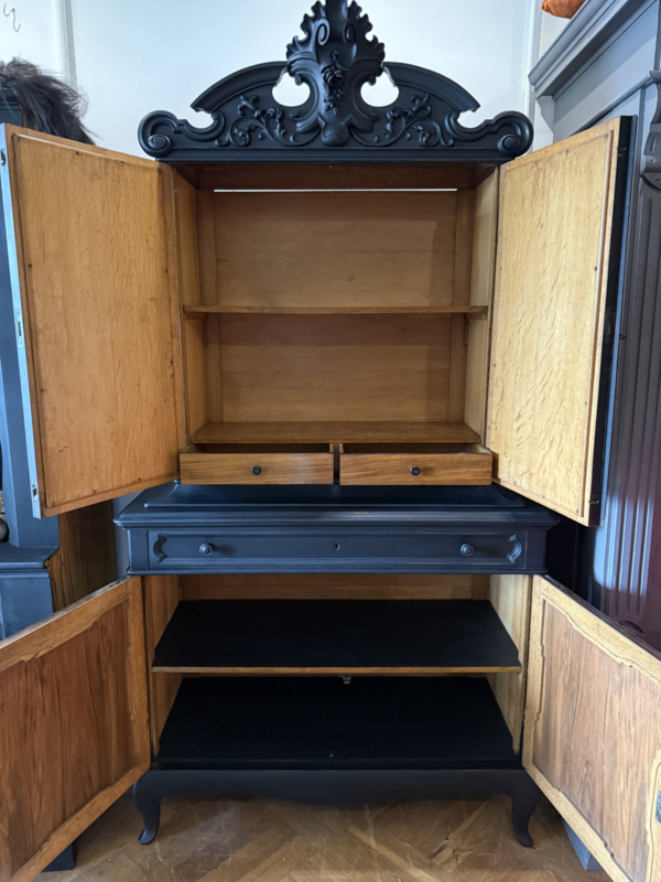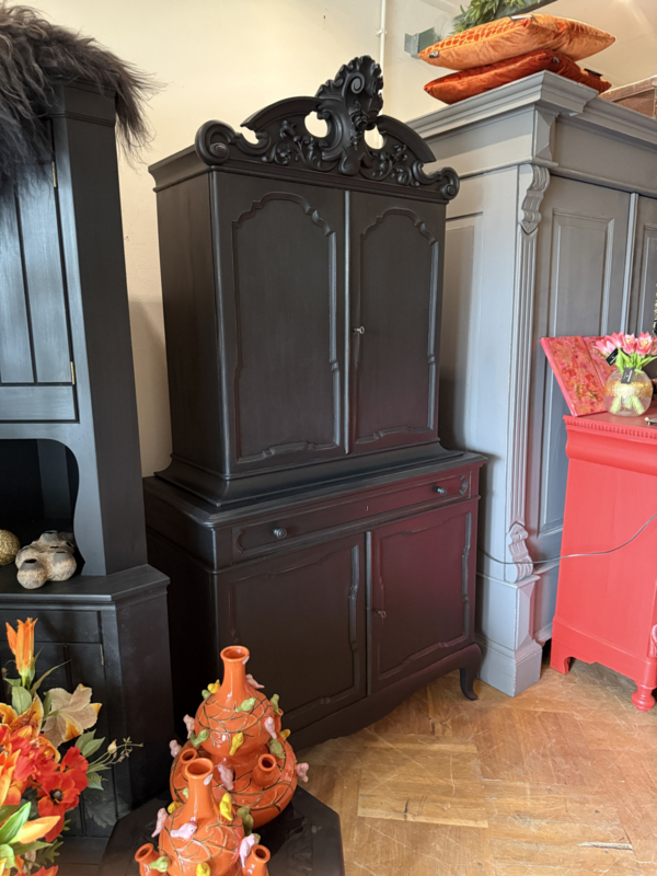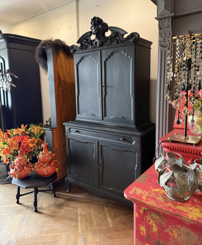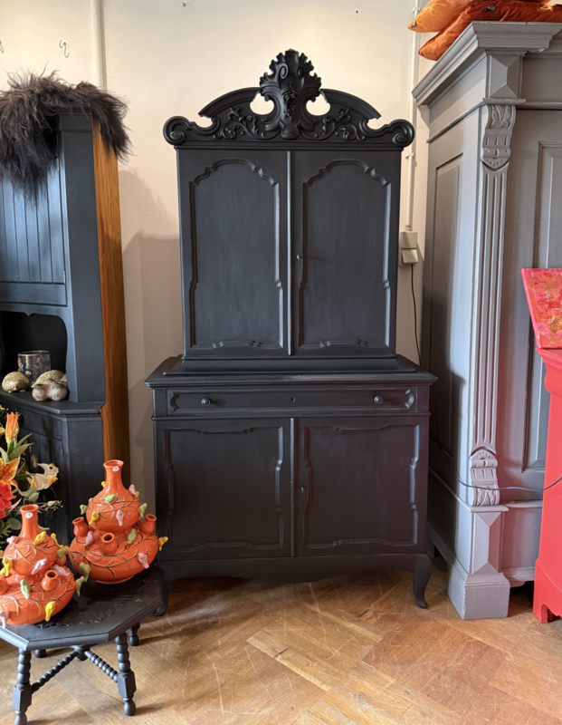 Artikelnummer: 260405 OverzichtAntieke buffetkast geschilderd met ORB Paint in de kleur Charcoal (zwart). Daarna hebben wij het sleets door geschuurd om het oude karakter te bewaren. De kast bestaat uit twee delen. Het onderste deel heeft achter de deuren één plank en bovenin een lade over de gehele breedte. Het bovendeel heeft achter de deuren twee kleine lades en ook één plank. Dit deel is voorzien van een prachtig uitgewerkte kuif. Uiterste maten van dit unieke meubel HxBxD 198x105x46,5cm.