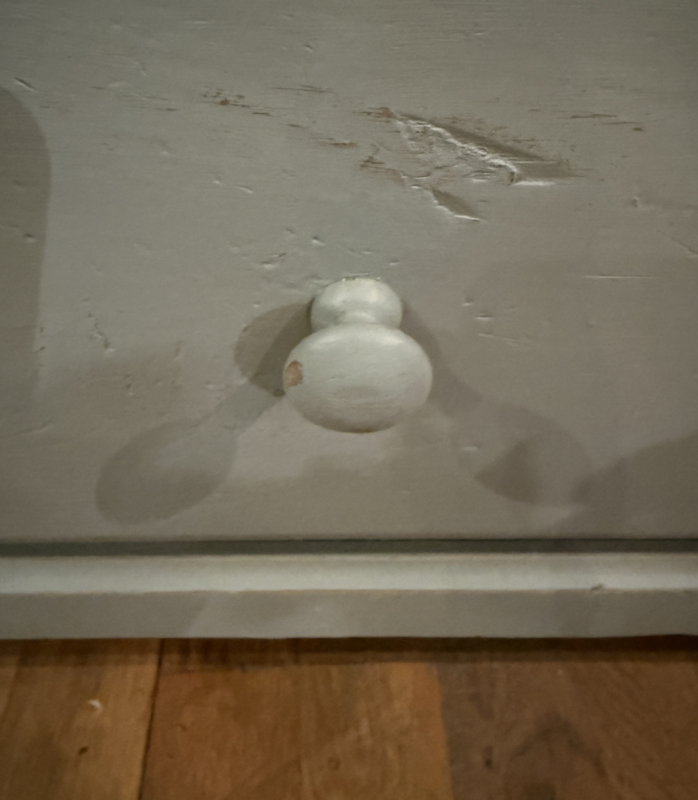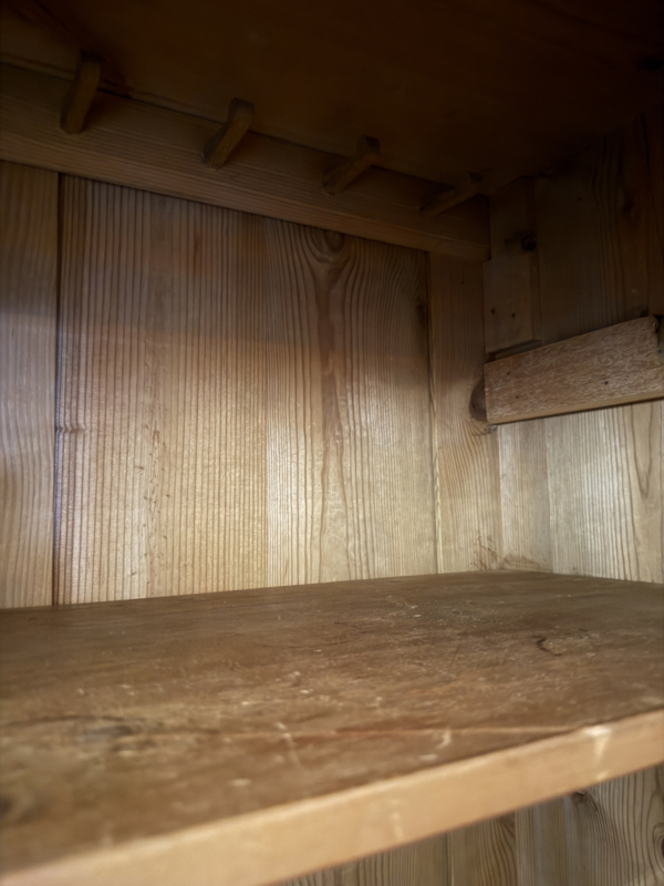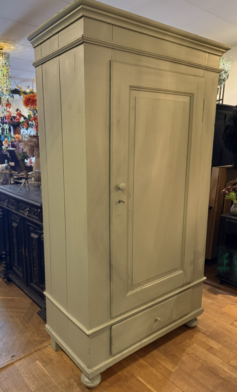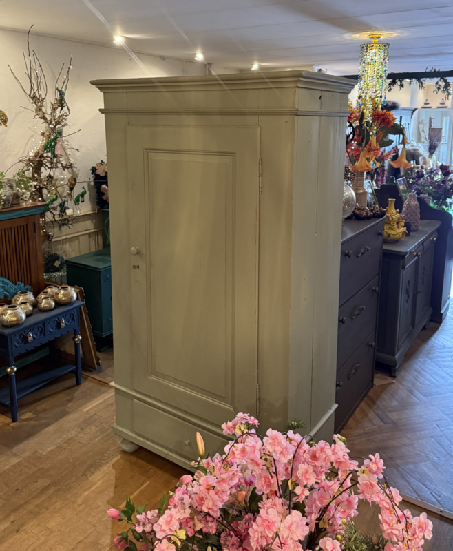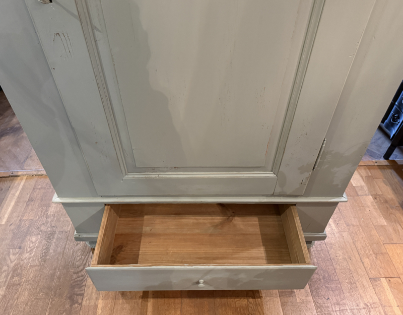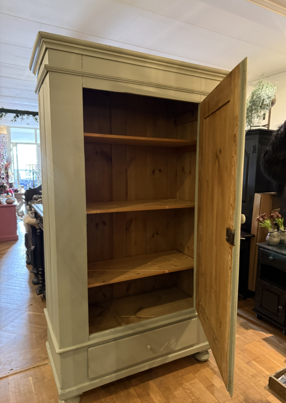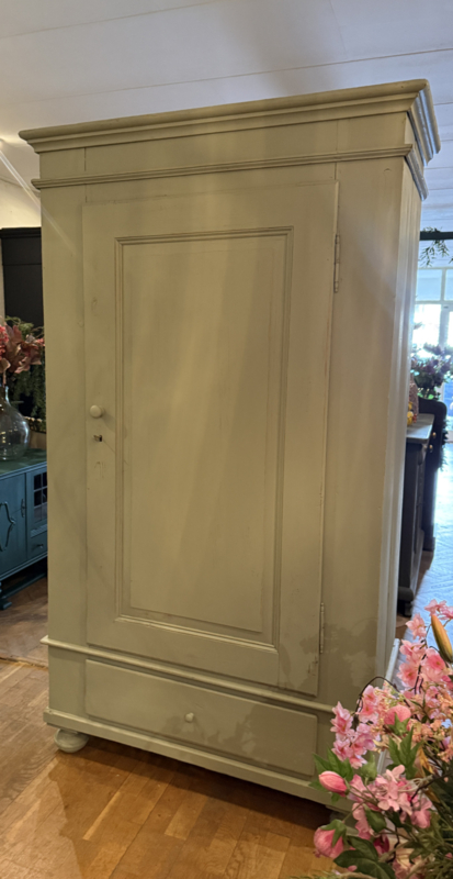 Artikelnummer: 260406 OverzichtVintage zeer doorleefde kast geschilderd in een prachtige kleur groen met grijsbruine ondertoon, een neutrale kleur die makkelijk te combineren is. Daarna is de kast flink door geschuurd om het oude karakter te bewaren. Deze stoere kast is van origine een garderobekast, de houten haken bovenin zitten er nog. Ook is er een mogelijkheid om een roede te plaatsen. Nu zitten er achter de grote deur drie planken waardoor er veel bergruimte is. Onderin nog een lade over de gehele breedte. De kast heeft veel gebruikerssporen en zichtbare knoesten en plekken waar geen knoesten meer zitten. Hou je van netjes dan hoort deze kast niet bij jou want deze kast leeft! Uiterste maten van deze karaktervolle kast HxBxD 201x115x56cm.