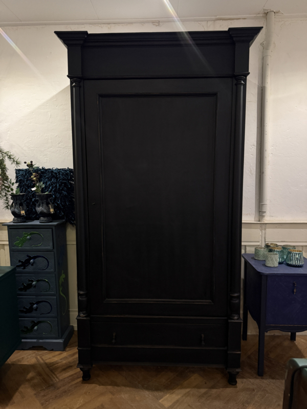 Antieke ééndeurskast, vintage garderobekastGrote antieke ééndeurskast geschilderd met zwart (Charcoal) en daarna flink door geschuurd om het oude karakter te bewaren. De kast is van origine een garderobekast maar desgewenst zijn er planken in te leggen en kun je er heel…