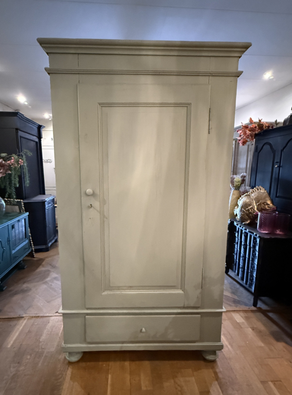 Antieke doorleefde ééndeurskast, oude kastVintage zeer doorleefde kast geschilderd in een prachtige kleur groen met grijsbruine ondertoon, een neutrale kleur die makkelijk te combineren is. Daarna is de kast flink door geschuurd om het oude karakter te bewaren. Deze…
