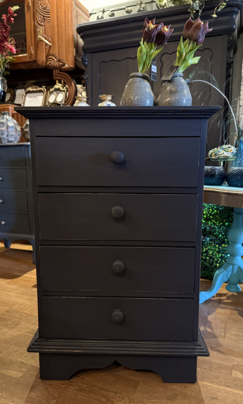 Oud ladekastje , 4-laads kastjeLadekastje geschilderd in heel donkergrijs (Antracite) waarna subtiel op de randjes sleets door geschuurd. De kast heeft 4 goedlopende lades met houten knoppen. Uiterste maten HxBxD 85x56x39cm.