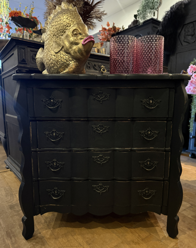 Orgelgebogen kastje, vintage ladekastOrgelgebogen kastje geschilderd in het zwart ((Charcoal) waarna subtiel door geschuurd om het oude karakter te bewaren. Dit vintage kastje heeft 4 lades voorzien van sierlijk beslag en is in goede vintage staat. Is het geen…