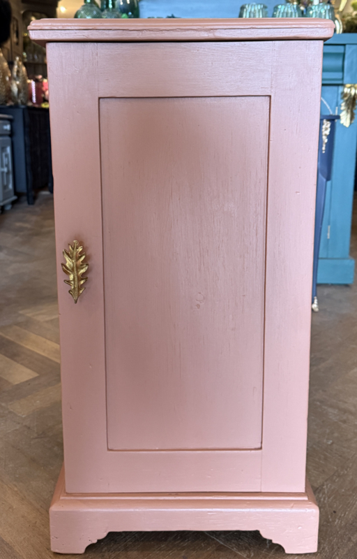 Vintage klein kastje, nachtkastjeVintage nachtkastje geschilderd in een abrikoos kleur. De knop hebben we vervangen voor een goudkleurig blad. Achter het deurtje een ruimte met één plankje. Is het geen plaatje? Uiterste maten HxBxD 74x38x33cm.